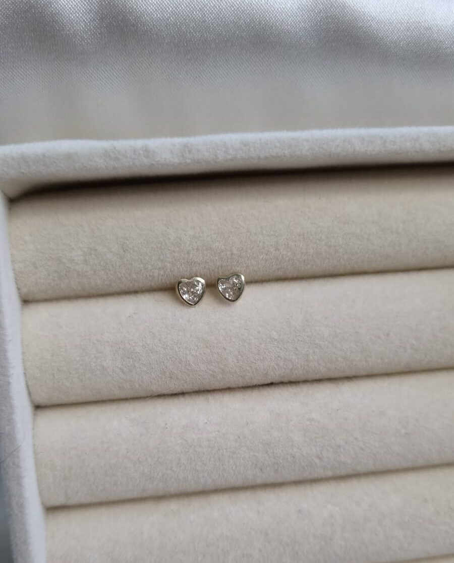 Aretes de bolita, corazón mini circonia, oro 10k