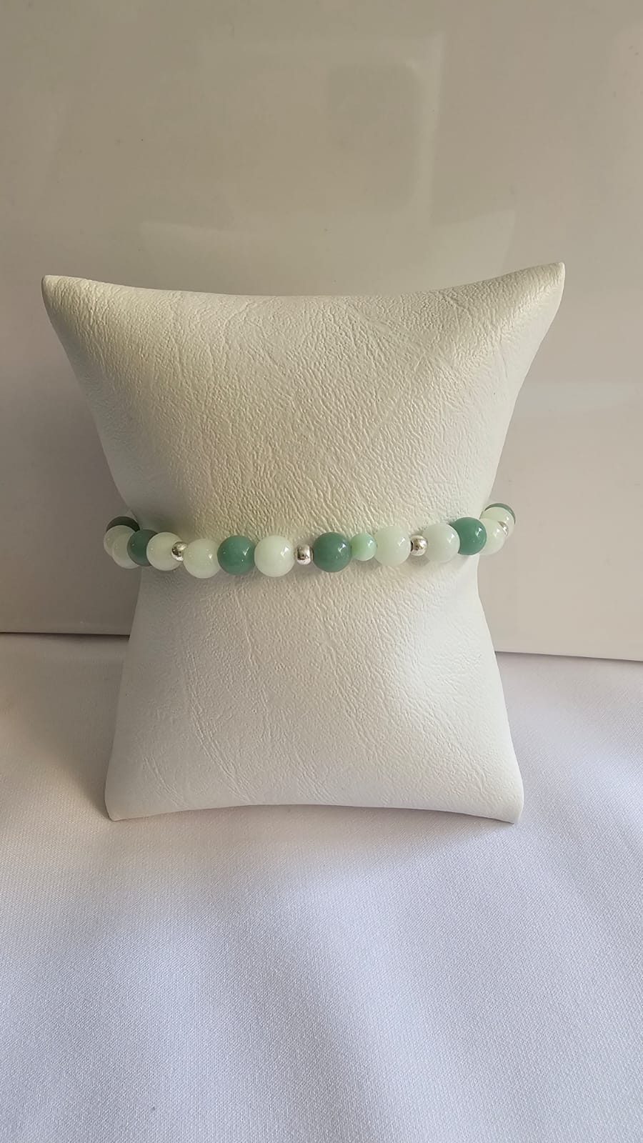 Pulsera de broche, piedra natural y balines, tonos verde, plata