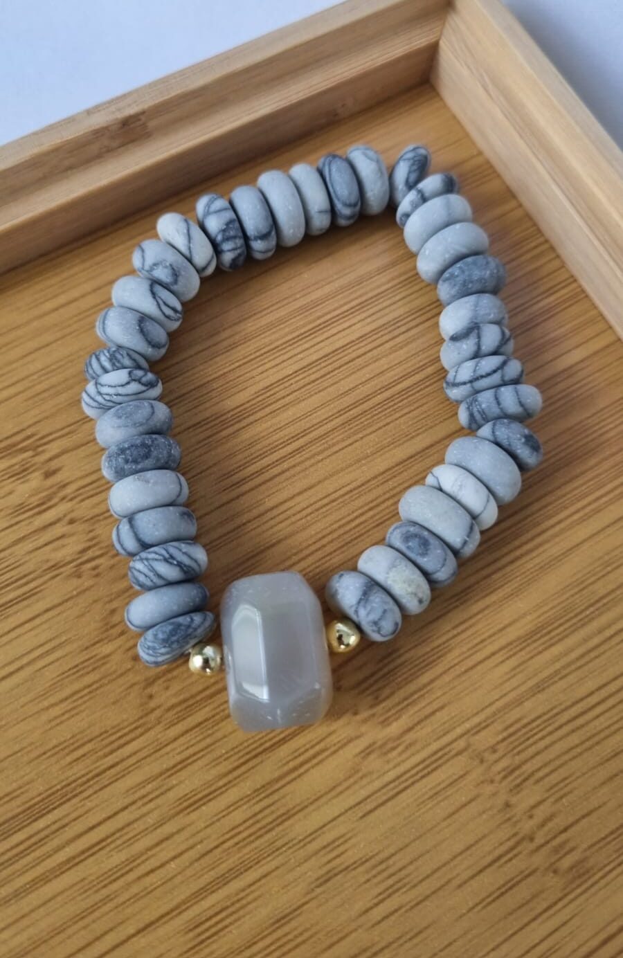 InicioPULSERASPulseras ElásticasPulsera de piedra natural gris manchada, opaca, piedra grande centro