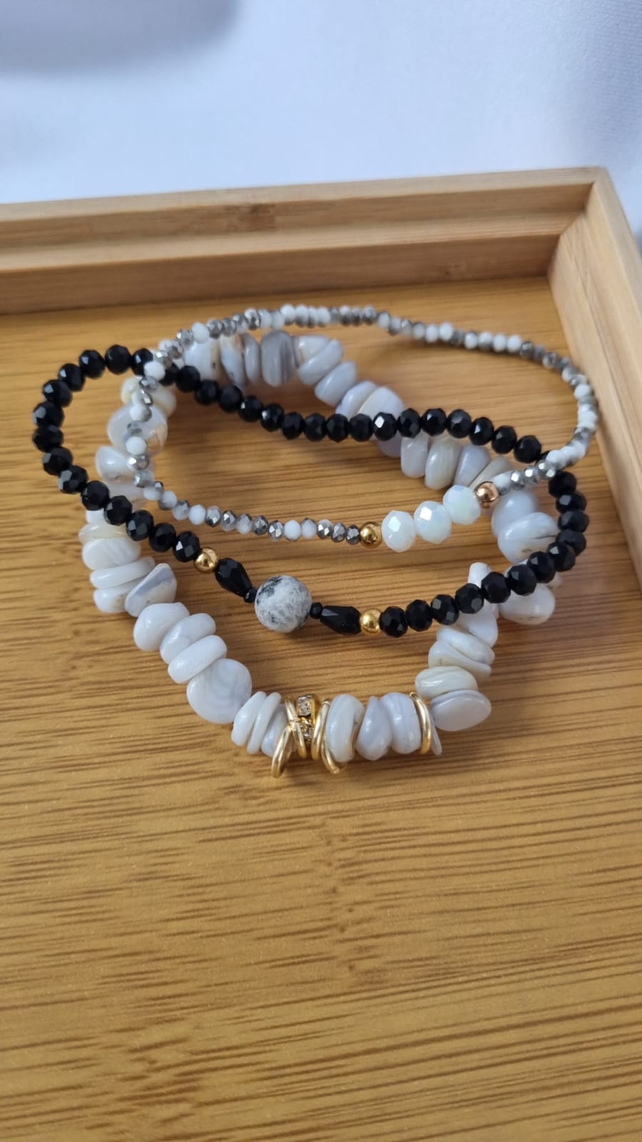 Set de 3 pulseras elásticas, piedra cortada blanca, de cristales gris y negra