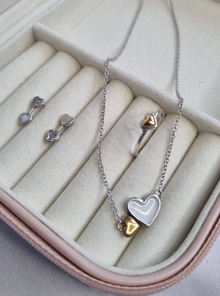 Set de gargantilla y aretes, corazón blanco y dorado, diseño P.andora, plata